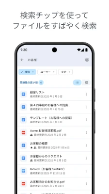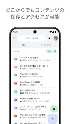 Google ドライブは、あなたのデジタルライフの中心となるセキュアなクラウドストレージです。どこにいても、どのデバイスからでも大切なファイルに安全にアクセスし、管理できる自由を体験してください。PDF、Officeドキュメント、動画など、100種類を超える多様なファイルを直接閲覧、編集、保存できるため、ファイル形式の心配はもう不要です。洗練された検索機能と柔軟なフィルター設定により、目的の情報を瞬時に見つけ出すことができます。